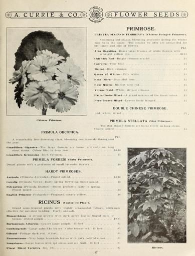 | Keywords: Garden and farm seeds (16371863742).jpg rt £ L« <br> A CURRIE C O m II <br> FLOWER SEEDS m <br> PRIMROSE <br> I'RIMULA SINENSIS FIMBRIATA Chinese Fringed Primrose <br> Charming- pot-plants blooming- profusely during- the winter <br> months in the house The strains we offer are unexcelled for <br> brilliancy and size of flowers <br> Pkt <br> Alba Magnifica ” Bears large trusses of white flowers with <br> a brig-ht yellow eye- 0 15 <br> Chiswick Red ” Bright crimson-scarlet 15 <br> Coerulea ” True blue 15 <br> Meteor ” Rich crimson 15 <br> Queen of Whites ” Pure white 15 <br> Rosy Morn ” Beautiful rose 15 <br> Ruby Q ueen ” Richest deep red 15 <br> Village Maid ” White striped crimson 15 <br> Extra Choice Mixed ” A grand mixture of the finest colors 15 <br> Fern-Leaved Mixed ” Leaves finely fring-ed 15 <br> DOUBLE CHINESE PRIMROSE <br> Red white mixed 25 <br> Chinese Primrose <br> PRIMULA OBCONICA <br> A remarkably free-flowering- class blooming continuously throughout <br> the year <br> Grandiflorn Gigantea ” The large flowers are borne profusely on long <br> stout stems Colors lilac to deep rose 0 10 <br> Grandiflora Kerniesiua ” Rich Crimson 15 <br> PRIMULA FORBESI Raby Primrose <br> Dwarf plants with a profusion of small lavender flowers 10 <br> HARDY PRIMROSES <br> Auricula Primula Auricula ” Finest mixed 0 10 <br> Cowslip Primula Ver s ” Early spring- flowering finest mixed - 10 <br> PRIMULA STELLATA Star Primrose <br> The star-shaped flowers are borne freely on long stems <br> Choice Mixed <br> Pkt <br> Polyanthus Primula Elatior ” Bloom profusely early in spring <br> Finest mixed <br> English Primrose Vulgaris ” Fragrant canary-yellow <br> 10 <br> 10 <br> RICINUS Castor-Oil Plant <br> Grand semi-tropical plants witli highly ornamental foliage strikingly <br> effective for out-door bedding Hardy annuals <br> Bismarekiana ” A strong grower with dark green leaves tinged metallic <br> bronze ribbed purple 0 05 <br> Borboniensis Arboreus ” Leaves large purple 15 feet <br> Cambodgensis ” Large palm-like leaves Color bronze-rid 15 feet <br> Glbsoni ” Foliage dark red 6 feet <br> Pnnormitnuns ” Very large brownish leaves With dark colored stems <br> Sanguineus ” Large leaves with red stems and rod fruit 10 feet <br> Finest Mixed Varieties ” Qz 10c <br> Cr7 <br> 05 <br> 05 <br> 05 <br> 0 5 <br> 05 <br> 05 <br> Riciuus 42156519 132761 65916 Page 67 Text http //www biodiversitylibrary org/page/42156519 1912 10 5962/bhl title 65916 A Currie Company ; Henry G Gilbert Nursery and Seed Trade Catalog Collection NameFound Arboreus NameConfirmed Arboreus NameBankID 5128807 NameFound Auricula NameConfirmed Auricula EOLID 15518830 NameBankID 241260 NameFound Cambodgensis NameFound Gigantea NameConfirmed Gigantea EOLID 91906 NameBankID 4549793 NameFound Grandiflora NameFound Kerniesiua NameFound Polyanthus NameConfirmed Polyanthus NameBankID 3485302 NameFound Primula forbesi NameConfirmed Primula forbesii EOLID 2891926 NameBankID 3423581 NameFound Primula obconica NameConfirmed Primula obconica EOLID 2892004 NameBankID 5850681 NameFound Primula stellata NameFound Ricinus NameConfirmed Ricinus L EOLID 107750 NameFound Sanguineus Biodiversity Heritage Library Garden and farm seeds spring 1912 Garden Stories Bulbs Plants Catalogs Equipment and supplies Flowers Gardening Nurseries Horticulture Plants Ornamental Seeds Vegetables U S Department of Agriculture National Agricultural Library bhl page 42156519 dc identifier http //biodiversitylibrary org/page/42156519 bhlGardenStories BHLinbloom bulbs plants nurseries horticulture plants ornamental u s department of agriculture national agricultural library bhlgardenstories bhlinbloom Information field Flickr posted date ISOdate 2015-01-26 Check categories 2015 August 25 CC-BY-2 0 BioDivLibrary https //flickr com/photos/61021753 N02/16371863742 2015-08-25 06 52 43 cc-by-2 0 PD-old-70-1923 Garden and farm seeds 1912 Photos uploaded from Flickr by Fæ using a script |