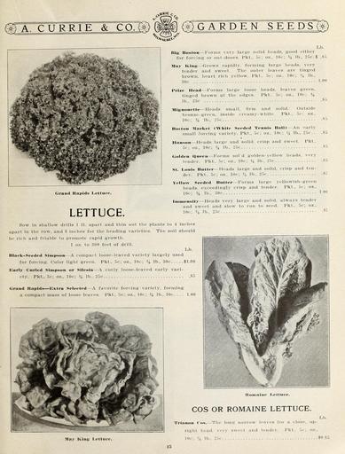 | Keywords: Garden and farm seeds (16372661035).jpg A CURRIE CO j <br> GARDEN SEEDS <br> Grand Rapids Lettuce <br> LETTUCE <br> Lb <br> Big Boston Forms very large solid heads good either <br> for forcing or out-doors Pkt 5c; oz 10c; 'A lb 25c 85 <br> May King Grows rapidly forming large heads very <br> tender and sweet The outer leaves are tinged <br> brown heart rich yellow Pkt 5c; oz 10c; lb <br> 30c 1-00 <br> Prize Head Forms large loose heads leaves green <br> tinged brown at the edges Pkt 5c; oz 10c; Vt <br> lb 25c 85 <br> Mignonette Heads small firm and solid Outside <br> bronze-green inside creamy-white Pkt 5c; oz <br> 10c; lb 25c s ' <br> Boston Market White Seeded Tennis Hall An early <br> small forcing variety Pkt 5c; oz 10c; lb 25c 85 <br> Hanson Heads large and solid crisp and sweet Pkt <br> 5c; oz 10c; lb 25c 85 <br> Golden Queen Forms sold golden-yellow beads very <br> tender Pkt 5c; oz 10c; lb 25c S5 <br> St Louis Butter Heads large and solid crisp and ten- <br> der Pkt 5c; oz 10c; Vi lb 25c 85 <br> Yellow Seeded Butter Forms large yellowish-green <br> heads exceedingly crisp and tender Pkt 5c; oz <br> 10c; lb 30c 10c <br> Immensity Heads very large and solid always tender <br> and sweet and slow to run to seed Pkt 5c; oz <br> 10c; lb 25c ˘ ˘ ˘ - 8f <br> Sow in shallow drills 1 ft apart and thin out the plants to 4 inches <br> apart in the row and 8 inches for the heading varieties The soil should <br> be rich and friable to promote rapid growth <br> 1 oz to 300 feet of drill <br> Lb <br> Black-Seeded Simpson A compact loose-leaved variety largely used <br> for forcing Color light green Pkt 5c; oz 10c; lb 30c 1 00 <br> Early Curled Simpson or Silesia A curly loose-leaved early vari- <br> ety Pkt 5c; oz 10c; lb 25c 85 <br> Grand Kapids Extra Seleeted A favorite forcing variety forming <br> a compact mass of loose leaves Pkt 5c; oz 10c; lb 30c 1 00 <br> Koiusiiiic Lettuce <br> COS OR ROMAINE LETTUCE <br> Lb <br> May King Lettuce <br> Trianon Cos The long narrow leaves for a close up- <br> right head very sweet and tender Pkt 5c; oz <br> 10c; '/ lb 35c f°- 85 <br> 15 42156467 132761 65916 Page 15 Text http //www biodiversitylibrary org/page/42156467 1912 10 5962/bhl title 65916 A Currie Company ; Henry G Gilbert Nursery and Seed Trade Catalog Collection Biodiversity Heritage Library Garden and farm seeds spring 1912 Garden Stories Bulbs Plants Catalogs Equipment and supplies Flowers Gardening Nurseries Horticulture Plants Ornamental Seeds Vegetables U S Department of Agriculture National Agricultural Library bhl page 42156467 dc identifier http //biodiversitylibrary org/page/42156467 bhlGardenStories BHLinbloom bulbs plants nurseries horticulture plants ornamental u s department of agriculture national agricultural library bhlgardenstories bhlinbloom Information field Flickr posted date ISOdate 2015-01-26 Check categories 2015 August 25 CC-BY-2 0 BioDivLibrary https //flickr com/photos/61021753 N02/16372661035 2015-08-25 06 52 01 cc-by-2 0 PD-old-70-1923 Garden and farm seeds 1912 Photos uploaded from Flickr by FĂŚ using a script |