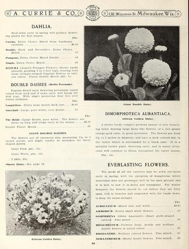 | Keywords: Garden and farm seeds (16372730155).jpg a £ Lfi <br> A CURRIE CO m flltj no Wisconsin st Milwaukee Wis gg <br> DAHLIA <br> Seed sown early in spring will produce flower- <br> ing plants the first season <br> Pkt <br> Cactus Extra Choice Mixed from handsome <br> varieties 0 10 <br> Double Show and Decorative Extra Choice <br> Mixed 10 <br> Pompone Extra Choice Mixed Double 10 <br> Single Extra Choice Mixed 05 <br> DATURA Angel's Trumpet Flower ” Showy hardy <br> annuals growing 3 to 4 feet high bearing very <br> large trumpet-shaped fragrant flowers in vari- <br> ous colors Finest Double Mixed pkt 5c <br> DOUBLE DAISIES Bellls Peiennis <br> Popular dwarf early flowering perennials easily <br> raised from seed and if sown early will bloom the <br> first year With slight protection they live over <br> winter outdoors <br> Pkt <br> Longfellow ” Extra large double dark rose 0 05 <br> Snowball ” Large pure white; very double 05 <br> Giant Double Daisy <br> Pkt <br> Tbe Bride ” Large double pure white The flower -; are <br> borne on long stiff stems early in the season 0 10 <br> Double Finest Mixed ¢ - 05 <br> GIANT DOUBLE DAISIES <br> The flowers are of enormous size measuring 2 to 3 <br> inches across and might readily be mistaken for finely <br> shaped Asters <br> Giant Pink pkt 15c <br> Giant White pkt 15c <br> 2 pkts 25c <br> Sbasta Daisy ” See page 52 <br> African Golden Daisy <br> DIMORPHOTECA AURANTIACA <br> African Golden Daisy <br> A showy hardy compact growing annual of neat branch- <br> ing habit bearing large daisy-like flowers of a rich glossy <br> orange-gold color in great profusion The flowers are from <br> 2 to 3 inches in diameter and have a dark colored disc in <br> the center which is surrounded by a black zone It is a <br> splendid border plant flowering early and in sunny situa- <br> tions will continue to bloom throughout the entire season <br> Pkt 10c <br> EVERLASTING FLOWERS <br> The seeds of all the varieties may be sown out-doors <br> early in spring with the exception of Gomphrena which <br> sometimes does not germinate 'well in the open ground and <br> it is best to sow it in-doors and transplant For winter <br> bouquets the flowers should be cut before they are fully <br> open tied in bunches and suspended with the heads down <br> to keep the stems straight <br> Pkt <br> ACROCL IIVUM ” Mixed rose and white 0 05 <br> AMMOBIUM ” Pretty small white flowers 05 <br> GOMPHRENA Globe Amaranth ” Small globe-shaped <br> colored Fine mixed 05 <br> HEHCHRYSUM ” Flowers large double and brilliant <br> double flowers in mixed colors 05 <br> RHODANTHE ” Brilliant colored flowers Fine mixed 05 <br> XERANTHEMUM ” Showy double flowers Fine mixed 05 <br> 54 42156506 132761 65916 Page 54 Text http //www biodiversitylibrary org/page/42156506 1912 10 5962/bhl title 65916 A Currie Company ; Henry G Gilbert Nursery and Seed Trade Catalog Collection NameFound Ammobium NameConfirmed Ammobium EOLID 6262731 NameBankID 1671531 NameFound Datura NameConfirmed Datura L EOLID 8762055 NameFound Gomphrena NameConfirmed Gomphrena EOLID 50431 NameBankID 2646957 NameFound Rhodanthe NameConfirmed Rhodanthe EOLID 2918025 NameBankID 1674221 NameFound Rhodanthe NameConfirmed Rhodanthe EOLID 2918025 NameBankID 4894040 NameFound Xeranthemum NameConfirmed XERANTHEMUM EOLID 6261623 NameBankID 1671556 Biodiversity Heritage Library Garden and farm seeds spring 1912 Garden Stories Bulbs Plants Catalogs Equipment and supplies Flowers Gardening Nurseries Horticulture Plants Ornamental Seeds Vegetables U S Department of Agriculture National Agricultural Library bhl page 42156506 dc identifier http //biodiversitylibrary org/page/42156506 bhlGardenStories BHLinbloom bulbs plants nurseries horticulture plants ornamental u s department of agriculture national agricultural library bhlgardenstories bhlinbloom Information field Flickr posted date ISOdate 2015-01-26 Check categories 2015 August 25 CC-BY-2 0 BioDivLibrary https //flickr com/photos/61021753 N02/16372730155 2015-08-25 06 52 09 cc-by-2 0 PD-old-70-1923 Garden and farm seeds 1912 Photos uploaded from Flickr by Fæ using a script |