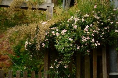 Keywords: garden garden fence heck roses overgrown fence paling wood fence wood summer bloom romantic ingrowing lush nature idyll idyllic