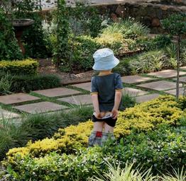 Keywords: garden green shrubs foliage path paving figure of boy pulling up scants day time