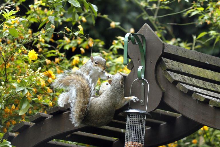 Keywords: garden greenery squirrels fight grey outdoor trees shrubs wood seat nuts feeder wild animal