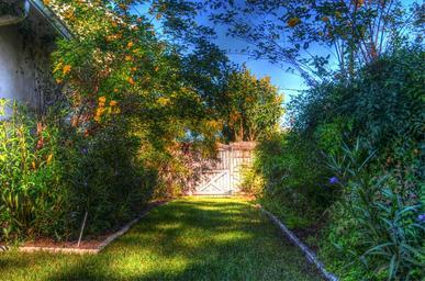 Keywords: garden nature gate wooden gate flowers blooms hdr