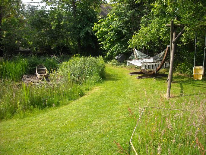 Keywords: garden nature green trees grass pond hammock rowing boat swing