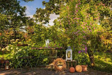 Keywords: garden seat garden table trees green rambler idyll inviting