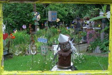 Keywords: garden view garden window sculpture figures wood steel sheet flowers green