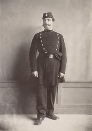 | Keywords: Gardien de la Paix.jpg Photograph Creator Hippolyte-Auguste Collard en City Police Préfecture Paris en Gardien de la Paix Whole-length to right handlebar moustache and goatee standing wearing a knee length coat with cape and hood peaked cap under hood small lantern hanging around his neck depicted people depicted place between 1876 1880 albumen silver 66 5 x 57 cm accession number H87 208/35 SLVIC-digitalimage 273521 H87 208/35 Album with leather covered cardboard covers 148 cardboard leaves holding 69 albumen silver print photographs on one side of leaf only Individual titles and official photographer stamped below image Title embossed on front cover with seal of the City of Paris in gilt ink ; title also on spine Label inside front cover reads Presented to the Public Library c Victoria on the eighth day of April 1881 by the Government of France Hand inscribed note on first page of album upper left Presented April 8th 1881 illegible Photographs various sizes 38 x 27 cm and smaller <br> Album was designed to show the use of photography in the solving of crimes and disasters Gift of the French Government possibly following the International Exhibition of 1880 <br> Official photographer's stamp on each page lower left some images dated 1876 and 1880 One photographer identified Hippolyte-Auguste Collard Institution State Library of Victoria object history exhibition history credit line Gift; Government of France; 1881 Information field Author Préfecture de police de Paris Service Photographique PD-100 Gardien de la paix Police officers in Paris Ville de Paris Préfecture de police Images of Paris from the State Library of Victoria |