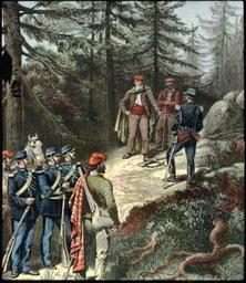 | Keywords: Garibaldi in the Alps 1.jpg 1 lithograph; 75 2 x 65 8 cm reformatted digital Abstract Untitled unsigned col lith ; Garibaldi and men all in red liberty caps meeting with regular soldiers in blue uniforms and kepis on mountain path Call Number Er-P 1895 ef-1e ASK Brown Call No General notes Upright folio matted on gray ornamental border; no margins; clean Subject Headings Garibaldi Giuseppe 1807-1882 Italy -- History -- War of 1859 Genre s lithographs Host Collection Prints Drawings and Watercolors from the Anne S K Brown Military Collection 1895 http //dl lib brown edu/repository2/repoman php verb render id 1328021285734376 unsigned PD-Art Uploaded with UploadWizard Giuseppe Garibaldi |