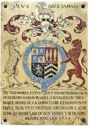 | Keywords: GarterPlateJohnRussell1stEarlOfBedford1539.png quarterly of four 1st grand quarter quarterly 1st 4th Argent a lion rampant gules on a chief sable three escallops of the first Russell ; 2nd 3rd Azure a tower argent de la Tour ; 2nd Gules three herrings hauriant argent Herringham ; 3rd Sable a griffin segreant between three crosses crosslet fitchy argent Froxmere ; 4th Sable three chevronnels ermine in dexter chief a crescent or for difference Wyse <ref>www middlesex-heraldry org uk Heraldry of the Bedford Chapel Chenies Bucks </ref> Crest A goat statant argentarmed and unguled or; Supporters Dexter A goat argent Sinister A lion rampant gules Debrett's Peerage 1968 p 131 with supporters on exchanged sides Motto Plus que Jamais More than Never Inscription Du tres noble et puisant Seigneur Johan Conte de Bedford Baron Russell Chevalier du tres noble Ordre de la Jarretiere et Garduen du Prive Seau fust enstalle a Wyndsor le XVIII jure de Maye l'an du Roy Henry VIII de son reigne XXXI l'an 1539 Of the very noble and powerful Lord John Earl of Bedford Baron Russell Knight of the Very Noble Order of the Garter and Keeper of the Privy Seal was installed at Windsor the 18th day of May the year of King Henry VIII of his reign the 31st the year 1539 References <references/> http //www royalcollection org uk/microsites/knightsofthegarter/MicroObject asp row 13 themeid 455 item 14 Artist unknown Uploaded by Lobsterthermidor <span class signature-talk >talk</span> 12 38 21 November 2013 UTC circa 1539 Nominated to KG 1539 PD-old-100 Stall plates of Knights of the Garter Henry VIII of England John Russell 1st Earl of Bedford |