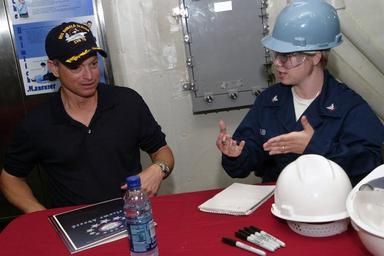 | Keywords: Gary Sinise on USS Ronald Reagan 2.jpg en Actor Gary Sinise listens to a question from Petty Officer 3rd Class Cara Maib during an interview on the mess decks of Nimitz-class aircraft carrier USS Ronald Reagan CVN 76 June 25 Organized through the United Service Organization USO Sinise toured and met with the crew of Ronald Reagan Reagan is in her homeport of San Diego following a three-month deployment to the Western Pacific http //www dvidshub net/index php script images/images_gallery php action viewimage fid 53336 Petty Officer 3rd Class Joe Painter 2007-06-25 PD-USGov-Military-Navy Gary Sinise Guests aboard USS Ronald Reagan CVN-76 Mess decks of USS Ronald Reagan CVN-76 |