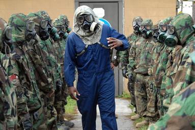 | Keywords: Gas Mask Safety Demonstrated DVIDS111100.jpg en Petty Officer 1st Class Brian Harrison a chemical biological and radiological team member assigned to Naval Mobile Construction Battalion 11 provides instruction to Charlie Company before they enter the confidence chamber The CBR exercise is one of many qualifications necessary for the Seabees upcoming deployment to the U S Central Command area of responsibility 2008-08-26 Petty Officer 2nd Class Erick Holmes https //www dvidshub net/image/111100 080826-N-+++++-089 2008-08-26 16 54 GULFPORT MS US PD-USGov-Military-Navy Gas masks Images from DoD uploaded by Fæ |