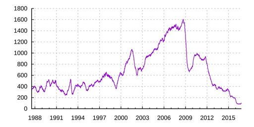 | Keywords: Gas weekly USA.svg de Anzahl der aktiven Erdgasbohrstellen in den USA aufgezeichnet in wöchentlichen Intervallen seit dem 17 Juli 1987 Stand 14 Oktober 2016 ; Datenquelle Baker Hughes Incorporated North America Rig Count http //phx corporate-ir net/External File item UGFyZW50SUQ9NjQ4NDgxfENoaWxkSUQ9MzU0ODUzfFR5cGU9MQ t 1 Rohdaten als Excel-Datei Blatt žUS Oil Gas Split en Natural gas rig count in the United States recorded in weekly intervals since 17 June 1987 as of 14 October 2016 ; data source Baker Hughes Incorporated North America Rig Count http //phx corporate-ir net/External File item UGFyZW50SUQ9NjQ4NDgxfENoaWxkSUQ9MzU0ODUzfFR5cGU9MQ t 1 raw data as excel file sheet US Oil Gas Split 2015-02-11 own StefanPohl other versions cc-zero v data << EOD Source http //phx corporate-ir net/phoenix zhtml c 79687 p irol-reportsother Baker Hughes Gas Split Date Gas 1987-07-17 337 1987-07-24 331 1987-07-31 346 1987-08-07 349 1987-08-14 352 1987-08-21 354 1987-08-28 361 1987-09-04 369 1987-09-11 364 1987-09-18 367 1987-09-25 356 1987-10-02 367 1987-10-09 378 1987-10-16 391 1987-10-23 372 1987-10-30 374 1987-11-06 387 1987-11-13 393 1987-11-20 386 1987-11-27 389 1987-12-04 394 1987-12-11 399 1987-12-18 405 1987-12-25 412 1988-01-01 392 1988-01-08 390 1988-01-15 392 1988-01-22 390 1988-01-29 366 1988-02-05 381 1988-02-12 385 1988-02-19 377 1988-02-26 365 1988-03-04 360 1988-03-11 342 1988-03-18 326 1988-03-25 322 1988-04-01 330 1988-04-08 315 1988-04-15 310 1988-04-22 307 1988-04-29 308 1988-05-06 308 1988-05-13 299 1988-05-20 291 1988-05-27 295 1988-06-03 304 1988-06-10 310 1988-06-17 321 1988-06-24 301 1988-07-01 314 1988-07-08 318 1988-07-15 297 1988-07-22 308 1988-07-29 314 1988-08-05 340 1988-08-12 335 1988-08-19 342 1988-08-26 346 1988-09-02 381 1988-09-09 399 1988-09-16 396 1988-09-23 383 1988-09-30 370 1988-10-07 372 1988-10-14 373 1988-10-21 379 1988-10-28 391 1988-11-04 416 1988-11-11 403 1988-11-18 409 1988-11-25 395 1988-12-02 397 1988-12-09 390 1988-12-16 400 1988-12-23 400 1988-12-30 384 1989-01-06 375 1989-01-13 346 1989-01-20 354 1989-01-27 362 1989-02-03 363 1989-02-10 334 1989-02-17 350 1989-02-24 341 1989-03-03 337 1989-03-10 327 1989-03-17 314 1989-03-24 320 1989-03-31 341 1989-04-07 325 1989-04-14 304 1989-04-21 317 1989-04-28 305 1989-05-05 311 1989-05-12 310 1989-05-19 304 1989-05-26 323 1989-06-02 341 1989-06-09 353 1989-06-16 367 1989-06-23 368 1989-06-30 364 1989-07-07 373 1989-07-14 382 1989-07-21 399 1989-07-28 413 1989-08-04 420 1989-08-11 414 1989-08-18 463 1989-08-25 456 1989-09-01 474 1989-09-08 490 1989-09-15 486 1989-09-22 485 1989-09-29 489 1989-10-06 485 1989-10-13 475 1989-10-20 480 1989-10-27 482 1989-11-03 491 1989-11-10 487 1989-11-17 499 1989-11-24 514 1989-12-01 522 1989-12-08 523 1989-12-15 519 1989-12-22 505 1989-12-29 502 1990-01-05 488 1990-01-12 484 1990-01-19 462 1990-01-26 447 1990-02-02 434 1990-02-09 397 1990-02-16 413 1990-02-23 405 1990-03-02 409 1990-03-09 435 1990-03-16 424 1990-03-23 414 1990-03-30 425 1990-04-06 445 1990-04-13 447 1990-04-20 467 1990-04-27 451 1990-05-04 450 1990-05-11 458 1990-05-18 465 1990-05-25 485 1990-06-01 475 1990-06-08 489 1990-06-15 500 1990-06-22 516 1990-06-29 516 1990-07-06 509 1990-07-13 495 1990-07-20 496 1990-07-27 466 1990-08-03 457 1990-08-10 472 1990-08-17 459 1990-08-24 475 1990-08-31 453 1990-09-07 454 1990-09-14 466 1990-09-21 467 1990-09-28 470 1990-10-05 456 1990-10-12 453 1990-10-19 480 1990-10-26 488 1990-11-02 513 1990-11-09 480 1990-11-16 474 1990-11-23 513 1990-11-30 495 1990-12-07 495 1990-12-14 457 1990-12-21 427 1990-12-28 424 1991-01-04 432 1991-01-11 413 1991-01-18 410 1991-01-25 396 1991-02-01 409 1991-02-08 408 1991-02-15 407 1991-02-22 397 1991-03-01 400 1991-03-08 394 1991-03-15 374 1991-03-22 389 1991-03-29 393 1991-04-05 382 1991-04-12 383 1991-04-19 367 1991-04-26 347 1991-05-03 350 1991-05-10 353 1991-05-17 352 1991-05-24 361 1991-05-31 352 1991-06-07 344 1991-06-14 345 1991-06-21 340 1991-06-28 337 1991-07-05 332 1991-07-12 338 1991-07-19 328 1991-07-26 329 1991-08-02 314 1991-08-09 318 1991-08-16 326 1991-08-23 332 1991-08-30 339 1991-09-06 336 1991-09-13 309 1991-09-20 303 1991-09-27 306 1991-10-04 320 1991-10-11 317 1991-10-18 340 1991-10-25 341 1991-11-01 335 1991-11-08 329 1991-11-15 322 1991-11-22 333 1991-11-29 321 1991-12-06 299 1991-12-13 306 1991-12-20 312 1991-12-27 316 1992-01-03 313 1992-01-10 312 1992-01-17 291 1992-01-24 291 1992-01-31 265 1992-02-07 277 1992-02-14 279 1992-02-21 280 1992-02-28 273 1992-03-06 262 1992-03-13 249 1992-03-20 245 1992-03-27 242 1992-04-03 253 1992-04-10 251 1992-04-17 250 1992-04-24 251 1992-05-01 260 1992-05-08 256 1992-05-15 262 1992-05-22 257 1992-05-29 263 1992-06-05 256 1992-06-12 242 1992-06-19 264 1992-06-26 276 1992-07-03 291 1992-07-10 306 1992-07-17 320 1992-07-24 318 1992-07-31 317 1992-08-07 329 1992-08-14 326 1992-08-21 336 1992-08-28 333 1992-09-04 345 1992-09-11 346 1992-09-18 356 1992-09-25 377 1992-10-02 381 1992-10-09 399 1992-10-16 399 1992-10-23 403 1992-10-30 415 1992-11-06 429 1992-11-13 440 1992-11-20 469 1992-11-27 466 1992-12-04 470 1992-12-11 494 1992-12-18 528 1992-12-23 525 1992-12-30 527 1993-01-08 515 1993-01-15 467 1993-01-22 434 1993-01-29 401 1993-02-05 374 1993-02-12 350 1993-02-19 313 1993-02-26 300 1993-03-05 277 1993-03-12 257 1993-03-19 270 1993-03-26 267 1993-03-31 278 1993-04-08 278 1993-04-16 262 1993-04-23 265 1993-04-30 268 1993-05-07 278 1993-05-14 283 1993-05-21 298 1993-05-28 315 1993-06-04 325 1993-06-11 327 1993-06-18 321 1993-06-25 335 1993-07-02 353 1993-07-09 346 1993-07-16 346 1993-07-23 376 1993-07-30 380 1993-08-06 377 1993-08-13 371 1993-08-20 395 1993-08-27 417 1993-09-03 419 1993-09-10 421 1993-09-17 422 1993-09-24 420 1993-10-01 422 1993-10-08 414 1993-10-15 409 1993-10-22 402 1993-10-29 410 1993-11-05 418 1993-11-12 412 1993-11-19 401 1993-11-26 400 1993-12-03 427 1993-12-10 417 1993-12-17 433 1993-12-22 430 1993-12-29 423 1994-01-07 442 1994-01-14 420 1994-01-21 413
