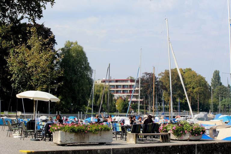 Keywords: gastronomy beach cafe guests boat harbour lake constance romanshorn