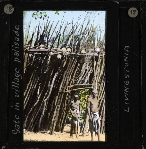 | Keywords: "Gate in Village Palisade, Livingstonia", Malawi, ca.1910 (imp-cswc-GB-237-CSWC47-LS4-1-018).jpg en <br> Gate in Village Palisade Livingstonia Malawi ca 1910 Photograph of three men and a young boy at the gate in a village wall or palisade A palisade is typically used as a defensive structure and the gate is an open space Human skulls can be seen along the top of the palisade The village wall likely belongs to a Ngoni tribe The Ngoni people are an ethnic group living in Malawi Mozambique Tanzania and Zambia in east-central Africa The Ngoni trace their origins to the Zulu people of kwaZulu-Natal in South Africa ; This belongs to a series of Church of Scotland Foreign Missions Committee lantern slides relating to Rev Donald Fraser 1870-1933 Rev Donald Fraser the Scottish missionary was born in Argyllshire Scotland the son of a Free Church minister In his youth Rev Fraser helped found the Student Volunteer Movement in Britain and the World Student Christian Federation before beginning missionary service in Malawi with the Free Church of Scotland He worked in Malawi from 1896 until he returned to Scotland in 1925 He was first posted to Ekwendeni and later Embangweni Rev Fraser worked closely with the Ngoni people Photographer Unknown Filename imp-cswc-GB-237-CSWC47-LS4-1-018 tif Coverage date circa 1910 Part of collection International Mission Photography Archive ca 1860-ca 1960 Type images Part of subcollection Photographs from the Centre for the Study of World Christianity University of Edinburgh U K ca 1900-ca 1940s Repository name Centre for the Study of World Christianity Archival file impaunpub_Volume7/1467 url Repository address The University of Edinburgh School of Divinity New College Mound Place Edinburgh EH1 2LX United Kingdom Geographic subject country Malawi Format aacr2 1 lantern slide 8 x 8 cm Geographic subject continent Africa Rights Contact the repository for details Part of series Donald Fraser of Loudon LS4/1 Repository email divinity-CSWC ed ac uk Subject lcsh Keyword Human settlements; Village communities Date created circa 1910 Publisher of the digital version University of Southern California Libraries Subject aat genre exterior views Format aat lantern slides Legacy record ID impa-m68515 Access conditions http //www ed ac uk/schools-departments/divinity/research/centres/world-christianity/collections-resources File GB 237 CSWC47/LS4/1/18 1910 author http //digitallibrary usc edu/cdm/ref/collection/p15799coll123/id/64588 PD-old-70-1923 Magic lantern images Images from USC Digital Library uploaded by Fæ International Mission Photography Archive ca 1860-ca 1960 History of Malawi Livingstonia Rumphi District Ethnic groups in Malawi |