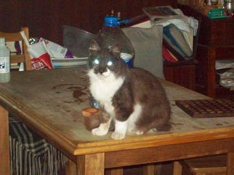 Keywords: Gato-fantasma.JPG es Es una foto de un gato en una mesa los ojos salieron así por el flash own Gelpgim22 2008-10-19 Domestic cats Blue and white cats Sitting cats Cats on tables Eyeshine cats