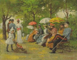 Keywords: Gause – Prater – ca. 1895.jpg Artwork Creator Wilhelm Gause Die Lästerallee im Prater ~ 1895 Oil on canvas cm 21 5 27 Wien Museum 117 379 W Gause lower right signature Regina Karner Michaela Lindinger Hrsg Großer Auftritt Mode der Ringstraßenzeit Katalog Wien Museum; Christian Brandstätter Verlag 2009; ISBN 978-3-85033-333-7 PD-old-auto 1916 Wilhelm Gause Paintings of Prater Paintings in the Wien Museum 1890s oil on canvas paintings Paintings of girls with dolls Vienna in the 1890s