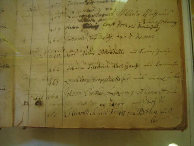 | Keywords: Gauss.jpg Immatrikulation 462 von Carl Friedrich Gauss own picture of signature into immatriculation book of Brunswick university as on display in 2005 exhibition book owned by university of Brunswick 2005-07-24 MyName Weltenprescher <span class signature-talk >talk</span> 20 45 13 May 2010 UTC Public Domain author died more than 70 years ago PD-old Carl Friedrich Gauß Signatures of scientists Gauss Signatures of people from Germany Gauss Signatures of physicists Gauss | ||||