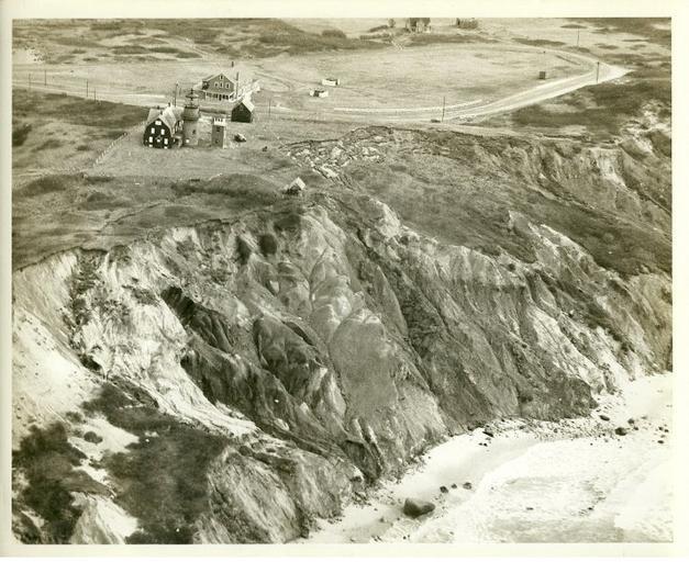 | Keywords: Gay Head Light - 1958 USCG aerial photograph.png Gay Head Lighthouse and surrounding environs taken from a northerly point-of-view By 1958 the Gay Head Light was no longer open to public access due to automation with electrical technology c 1954 When this photograph was taken the Fresnel lens had already been replaced with an electrical signal The Fresnel lens was relocated to the Dukes County Historical Society's grounds in Edgartown A few years after this photograph the Keeper's house; the nearby square brick WWII observation tower; the barn; and the small guest house near the cliffs were razed Only the lighthouse and the World War II bunker were not destroyed Not clearly visible in this photo is the WWII bunker that sits on the clay cliffs just below the so-called guest house Today the WWII bunker sits below the cliffs in the ocean's intertidal zone 2012-08-08 United States Coast Guard Photo from private collection of William Waterway PD-USGov Uploaded with UploadWizard Aquinnah Massachusetts Gay Head Light 1958 in Massachusetts Aerial photographs of Massachusetts |