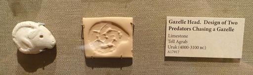 | Keywords: Gazelle head stamp seal with design of Two Predators Chasing a Gazelle, Tell Agrab, Uruk, 4000-3100 BC, limestone - Oriental Institute Museum, University of Chicago - DSC07203.JPG en Exhibit in the Oriental Institute Museum University of Chicago Chicago Illinois USA This work is old enough so that it is in the public domain Photography was permitted in the museum without restriction 2014-08-22 14 48 55 own Daderot other versions cc-zero Uruk Period stamp seals in the Oriental Institute Museum Uploaded with UploadWizard |