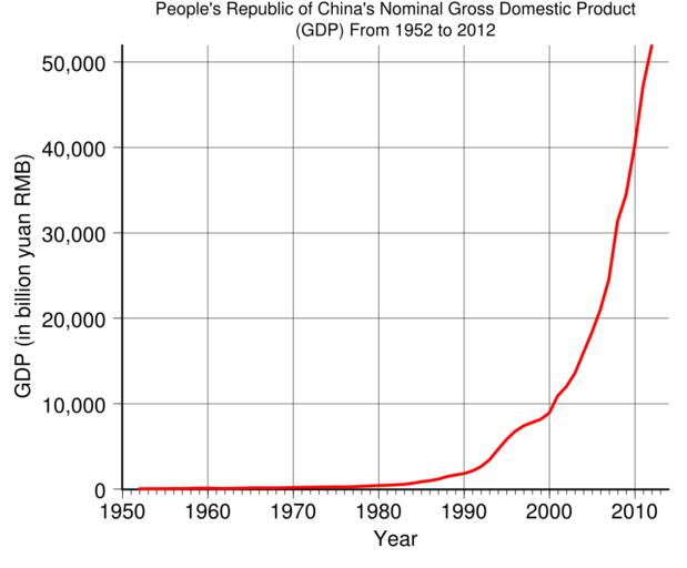 | Keywords: GDP of China in RMB.svg translate yes en GDP of China in billion yuan RMB from 1952 to 2012 Data from http //www chinability com/GDP htm GDP growth in China 1952-2011 2014-12-14 own Delphi234 other versions File GDP of China in RMB-semilog svg semi-log File GDP of China in RMB-zh-hans svg zh-hans File GDP of China in RMB from 1952 to 2000 svg 1952 to 2000 Generated with Wikimedia SVG Chart 1 s Data wikitable style text-align right colspan 2 RMB billion yuan - Year GDP - 1952 67 9 - 1953 82 4 - 1954 85 9 - 1955 91 0 - 1956 102 8 - 1957 106 8 - 1958 130 7 - 1959 143 9 - 1960 145 7 - 1961 122 0 - 1962 114 9 - 1963 123 3 - 1964 145 4 - 1965 171 6 - 1966 186 8 - 1967 177 4 - 1968 172 3 - 1969 193 8 - 1970 225 3 - 1971 242 6 - 1972 251 8 - 1973 272 1 - 1974 279 0 - 1975 299 7 - 1976 294 4 - 1977 320 2 - 1978 362 4 - 1979 403 8 - 1980 451 8 - 1981 486 2 - 1982 529 5 - 1983 593 5 - 1984 717 1 - 1985 896 4 - 1986 1020 2 - 1987 1196 3 - 1988 1492 8 - 1989 1690 9 - 1990 1854 8 - 1991 2161 8 - 1992 2663 8 - 1993 3463 4 - 1994 4675 9 - 1995 5847 8 - 1996 6788 5 - 1997 7446 3 - 1998 7834 5 - 1999 8206 8 - 2000 8946 8 - 2001 10965 5 - 2002 12033 3 - 2003 13582 3 - 2004 15987 8 - 2005 18386 8 - 2006 21087 1 - 2007 24661 9 - 2008 31404 5 - 2009 34506 9 - 2010 40201 2 - 2011 47288 2 - 2012 51932 2 cc-zero Uploaded with UploadWizard Economy of the People's Republic of China |