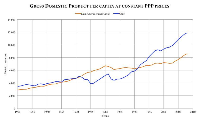Keywords: GDP per capita LA-Chile.png graph en Gross domestic product per capita at constant PPP prices 1950-2008 Latin America minus Cuba in orange and Chile in blue 2000 international dollars Sources http //www cepal org/deype/cuaderno37/esp/index htm ECLAC http //www cepal org/deype/cuaderno37/datos/1 1 1 1 xls 1 1 1 1 Producto interno bruto http //www cepal org/deype/cuaderno37/datos/A 1 xls A 1 Población total and http //www cepal org/deype/cuaderno37/datos/A 5 xls A 5 Tipos de cambio ; http //www imf org/external/pubs/ft/weo/2012/01/weodata/index aspx IMF's April 2012 WEO database http //www imf org/external/pubs/ft/weo/2012/01/weodata/weorept aspx pr x 31 pr y 8 sy 2000 ey 2000 scsm 1 ssd 1 sort country ds br 1 c 213 2C263 2C268 2C273 2C218 2C278 2C223 2C283 2C228 2C288 2C233 2C293 2C238 2C243 2C248 2C253 2C298 2C258 2C299 s PPPEX grp 0 a Implied PPP conversion rate for 2000 Latin America data includes Argentina Bolivia Brazil Chile Colombia Costa Rica Dominican Republic Ecuador El Salvador Guatemala Haiti Honduras México Nicaragua Panama Paraguay Peru Uruguay and Venezuela Does not include Cuba due to missing data Note GDP in constant 2000 US dollars was multiplied by the 2000 exchange rate to the US dollar and divided by the 2000 implied PPP conversion rate The result was divided by the population of the respective year own Cantus 2010-02-22 1980s Economy of Chile 1970s Graphs on Evolution of GDP per Capita |