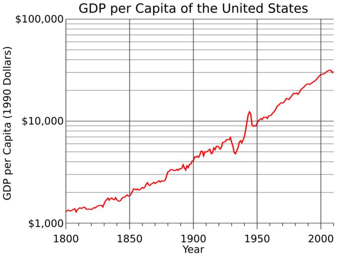 | Keywords: GDP per Capita of the United States-semilog-zh-hans.svg translate yes en Semi-log plot of GDP per capita of the United States from 1800 to 2010 in constant 1990 dollars showing a relatively constant growth Data is from http //www ggdc net/maddison/maddison-project/home htm Maddison Project Database 2014-12-16 File GDP per Capita of the United States-semilog svg Delphi234 other versions File GDP per Capita of the United States-semilog svg cc-zero Uploaded with UploadWizard Gross domestic product of the United States |
