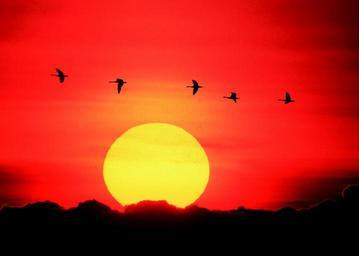 Keywords: geese flying sunset orange sun yellow wildlife birds waterfowl scenic