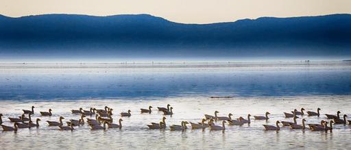 Keywords: geese horizon mist mountain sky calm nature landscape panorama cold morning birds wild fog