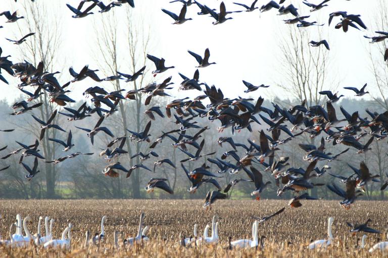 Keywords: geese whooper swan bird swans goose migratory bird water bird flock of birds migratory birds swarm field arable wild goose wild geese