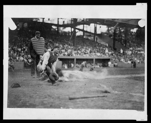 Keywords: Gehrigsliding.jpg en Title Umpire Nallan ready to make the call as Washington catcher Hank Severeid awaits ball while New York Yankee Lou Gehrig slides into home plate during baseball game Date Created/Published 1925 or 1926 Medium 1 photographic print Reproduction Number LC-USZ62-135395 b w film copy neg Rights Advisory No known restrictions on publication Call Number LOT 12344-1 item P P Repository Library of Congress Prints and Photographs Division Washington D C 20540 USA http //www loc gov/pictures/resource/cph 3c35395/ Library of Congress or 1925 1926 Lou Gehrig Washington Senators 1901-1960 1926 in baseball Plays at home plate Slide baseball PD-USGov