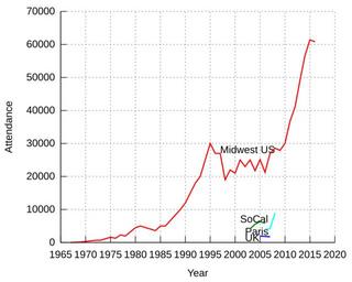 | Keywords: Gen-Con-Attendance.svg Graph of attendance to the Gen Con game fairs own original text I created this work entirely by myself 1 2009-03-29' ” Alan De Smet Talk Attendence for various w Gen Con conventions from 1967-2008 The data is from the w Gen Con and relies upon the citations given there When a range is given the smaller value is used Note that the data comes from a variety of sources and is sometimes calculated in different ways so values in comparison may not be equivalent measures Creation and Updates This graph was created with w gnuplot The files used to create it are below If there is new cited data at w Gen Con feel free to alert me and I'll be happy to update this graph The file cmd contained the following set terminal svg fname Arial fsize 14 set ylabel Attendance set xlabel Year set datafile missing 'NA' unset key set grid back lw 1 set border 3 set ytics nomirror set xtics nomirror set label Midwest US at 1997 28000 set label SoCal at 2001 7000 set label UK at 2002 1300 set label Paris at 2002 3200 plot \ gca csv using 1 2 with lines lw 2 title Milwaukee and Indianapolis \ gca csv using 1 3 with lines lw 2 title SoCal \ gca csv using 1 4 with lines lw 2 title UK \ gca csv using 1 5 with lines lw 2 title Paris \ The file gca csv contained Year Main SoCal UK Paris 1967 12 NA NA NA 1968 50 NA NA NA 1969 150 NA NA NA 1970 NA NA NA NA 1971 NA NA NA NA 1972 650 NA NA NA 1973 700 NA NA NA 1974 NA NA NA NA 1975 1600 NA NA NA 1976 1300 NA NA NA 1977 2300 NA NA NA 1978 2000 NA NA NA 1979 NA NA NA NA 1980 4500 NA NA NA 1981 5000 NA NA NA 1982 NA NA NA NA 1983 NA NA NA NA 1984 3600 NA NA NA 1985 5000 NA NA NA 1986 5000 NA NA NA 1987 NA NA NA NA 1988 NA NA NA NA 1989 10000 NA NA NA 1990 12000 NA NA NA 1991 15000 NA NA NA 1992 18000 NA NA NA 1993 20000 NA NA NA 1994 25000 NA NA NA 1995 30000 NA NA NA 1996 27000 NA NA NA 1997 27000 NA NA NA 1998 19000 NA NA NA 1999 22000 NA NA NA 2000 21000 NA NA NA 2001 25000 NA NA NA 2002 23000 NA NA NA 2003 25000 4148 NA NA 2004 21741 5559 NA NA 2005 25106 6326 1957 NA 2006 21250 5840 NA 4000 2007 27000 NA 1746 4200 2008 28600 NA NA 9000 2009 27900 NA NA NA 2010 30046 NA NA NA 2011 36733 NA NA NA 2012 41000 NA NA NA 2013 49058 NA NA NA 2014 56614 NA NA NA 2015 61423 NA NA NA 2016 60819 NA NA NA The output was created with the command gnuplot < cmd > out svg I disclaim any copyright on this image It is a mechanical creation by gnuplot with negligible creative input The data itself cannot be copyrighted Alan De Smet Original upload log page en wikipedia Gen-Con-Attendance svg 2009-03-30 02 40 Alan De Smet 600×480× 12610 bytes Attendence for various Gen Con conventions from 1967-2008 The data is from the Gen Con and relies upon the citations given there When a range is given the smaller value is used Note that the data comes from a variety of sources and is some Gen Con SVG line charts |