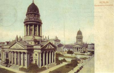 | Keywords: Gendarmenmarkt, Berlin 1900.png View of Gendarmenmarkt in Berlin around 1900 Blick auf den Gendarmenmarkt in Berlin um 1900 Scan from a postcard ~ 1900 Author No copyright stated on postcard PD-old Berlin 1900-1918 Französischer Dom Berlin Bell towers in Berlin Konzerthaus Berlin Deutscher Dom Berlin Deutscher und Französischer Dom Berlin |