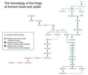 | Keywords: Genealogy of the kings of Israel and Judah.svg translation possible The genealogy of the kings of Israel and Judah Based on a literal interpretation of 1 and 2 Kings Note In the kings of Israel a horizontal arrow can indicate a change of dynasty lack of known genealogical connection Genealogy_of_the_kings_of_Israel_and_Judah png 2011-12-26 05 55 UTC Genealogy_of_the_kings_of_Israel_and_Judah png User Mr Absurd derivative work Jon C <span class signature-talk >talk</span> Other versions/Genealogy of the kings of Israel and Judah vectorized jkwchui Genealogy_of_the_kings_of_Israel_and_Judah png Ancient Israel and Judah Family trees Israelites Old Testament |