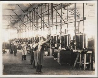 | Keywords: kalamazoo public library michigan history photography general gas light company heater fans testing worker assembly line factory manufacturing photo border Interior of General Gas Light Company, unit heater division. Original caption reads, "Test fans on the assembly line." Several unidentified men working on the line. KPL catalogue number P-84. Interior of General Gas Light Company, unit heater division. Original caption reads, "Test fans on the assembly line." Several unidentified men working on the line. KPL catalogue number P-84. |