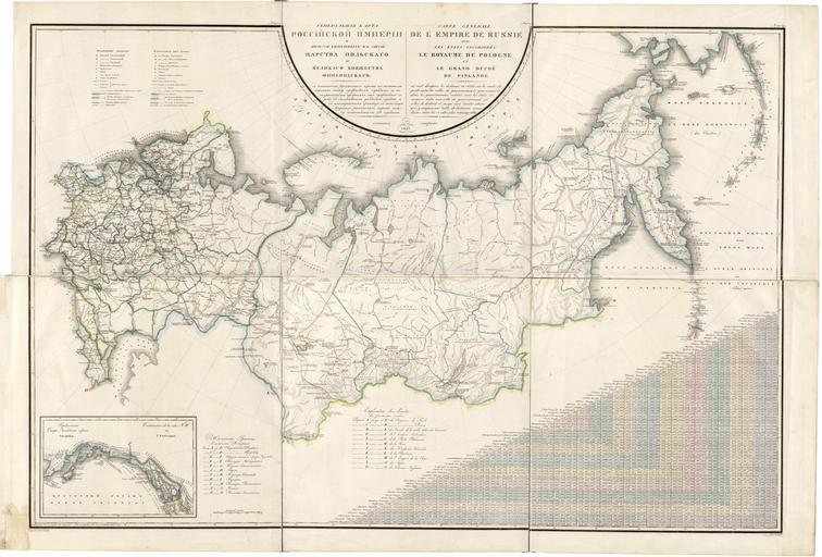 | Keywords: General Map of the Russian Empire and the Neighboring Polish Empire and Grand Duchy of Finland- With the Distance in Versts on Postal Roads Between Provincial Cities; and in Boundary Provinces from WDL2589.png Artwork ru Пядишев Василий Пет ович fr Piadyshev Vasiliĭ Petrovich en Piadyshev Vasiliĭ Petrovich zh 帕迪谢乌 瓦西利·佩特罗维奇 pt Piadyshev Vasiliĭ Petrovich ar بياديشيف فاسيليي بيتروفيتش es Piadyshev Vasiliĭ Petrovic ru Общая ка та Российской импе ии соседней Польской импе ии и Великого княжества Финляндия Расстояния между п овинциальными го одами указываются в ве стах на почтовых до огах; в пог аничных п овинциях - от п овинциального го ода fr Carte générale de l'Empire Russe et de l'Empire voisin Polonais et du Grand-Duché de Finlande Avec la distance en verstes des routes postales entre les villes de province et les provinces limitrophes en General Map of the Russian Empire and the Neighboring Polish Empire and Grand Duchy of Finland With the Distance in Versts on Postal Roads Between Provincial Cities; and in Boundary Provinces from the Provincial City zh 俄罗斯 国以及邻国波兰 国和芬兰大公国 般 图 级城市之间邮政公路俄里 离; 级城市到边界 的邮政公路俄里 离 pt Mapa geral do império russo e do império polaco vizinho e do Grão-Ducado da Finlândia Com a distância em versts das rotas postais entre cidades da província; e das Províncias Fronteiriças da Cidade Provincial ar خريطة عامة للامبراطورية الروسية والامبراطورية البولندية المجاورة لها ودوقية فنلندا الكبرى مع المسافة في الفيرست للطرق البريدية بين المدن الإقليمية؛ وحدود الأقاليم من المدينة الإقليمية ru Данная ка та Российской импе ии 1827 года входит в объемный т уд <i> Геог афический атлас Российской импе ии ца ства Польского и великого княжества Финляндского </i> в кото ом соб аны 61 ка та Российской импе ии Атлас был составлен и отпечатан полковником В П Пядышевым Он является свидетельством того насколько тщательно и под обно составлялись ка ты усскими военными ка тог афами пе вой четве тиXIX века а ка те показаны к упнейшие го ода пять типов в зависимости от азме а к епости цитадели заводы и фаб ики до оги четы е типа госуда ственные г аницы и г аницы п овинций Расстояния указаны в ве стах ве ста являлась усской единицей изме ения длины авной 1 0668 км кото ая к настоящему в емени вышла из упот ебления Условные обозначения и геог афические названия п иведены на усском и ф анцузском языках fr Cette carte de 1827 de l'Empire russeest extraite d'un ouvrage plus vaste <i>Atlas géographique de l'Empire russe du Royaume de Pologne et du Grand-Duché de Finlande</i> Geograficheskii atlas Rossiiskoi imperii tsarstva Pol'skogo i Velikogo kniazhestva Finliandskogo contenant 61 cartes de l'Empire russe Compilé et gravé par le colonel V P Piadyshev elle reflète la cartographie détaillée effectuée par les cartographes militaires russes durant le premier quart du 19ème siècle La carte indique les centres urbains cinq gradations selon la taille les forteresses redoutes usines et fabriques les routes quatre types les frontières des provinces et districts Les distances sont indiquées en verstes une unité de mesure russe qui n'est maintenant plus utilisée égale à 1 0668 kilomètre Les légendes et noms de lieux sont en russe et en français en This 1827 map of the Russian Empire is from a larger work <i>Geographical Atlas of the Russian Empire the Kingdom of Poland and the Grand Duchy of Finland</i> Geograficheskii atlas Rossiiskoi imperii tsarstva Pol'skogo i velikogo kniazhestva Finliandskogo containing 61 maps of the Russian Empire Compiled and engraved by Colonel V P Piadyshev it reflects the detailed mapping carried out by Russian military cartographers in the first quarter of the 19th century The map shows population centers five gradations by size fortresses redoubts plants and factories roads four types and state and provincial borders Distances are shown in versts a Russian measure now no longer used equal to 1 0668 kilometers Legends and place names are in Russian and French zh 这幅 1827 年的俄罗斯 国 图出自较大型的 图集 <i> 俄罗斯 国 波兰王国和芬兰大公国 理 图集 </i> (Geograficheskii atlas Rossiiskoi imperii tsarstva Pol'skogo i velikogo kniazhestva Finliandskogo),该 图集共包括 61 幅俄罗斯 国 图 这幅 图集由 V·P·Piadyshev 上校编制和刻版, 反映了 19 世纪前 25 年间俄罗斯军事制图师 达到的详细制图水平 该 图标注了人口中心(根据大小分成五个等级) 要塞 小型防御工事 工厂 道路(四种)以及 和 区的边界 离采用的单位是俄里,该单位目前已不再使用,1 俄里等于 1 0668 公里 图例和 名采用俄语和法语标注 pt Este mapa do Império Russo de 1827 provém de um trabalho maior <i>Atlas Geográfico do Império Russo do Reino da Polônia e do Grão-Ducado da Finlândia</i> Geograficheskii atlas Rossiiskoi