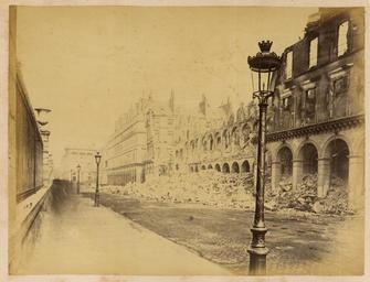 | Keywords: General View of the Ministry of Finance WDL1241.png Artwork ru Б аквейе Б уно 1823 1875 гг fr Braquehais Bruno 1823-1875 en Braquehais Bruno 1823-1875 zh 布鲁诺·布拉奇海 ,1823-1875 年 pt Braquehais Bruno 1823-1875 ar براكهيه برونو، 1823-1875 es Braquehais Bruno 1823-1875 ru Общий вид инисте ства финансов fr Vue générale du ministère des Finances en General View of the Ministry of Finance zh 财政部全景 pt Vista geral do Ministério das Finanças ar منظر عام لوزارة المالية ru П ичиной ф анко-п усской войны стал ост нап яженности в отношениях между Ф анцией и П уссией в 1860-х гг Ф анция п и импе ато е аполеоне III была полна ешимости п ове ить астущую силу П уссии и отомстить за то что она ассмат ивала как яд дипломатических унижений П уссия п и канцле е Отто фон Бисма ке считала что война ге манских госуда ств п отив Ф анции под уководством П уссии станет ешающим шагом к созданию единой Ге манской импе ии Конфликт начался 19 июля 1870 г когда Ф анция объявила войну Ф анцузская а мия оказалась ужасно неподготовленной и поте пела сок ушительное по ажение в битве п и Седане отк ыв до огу на Па иж К 19 сентяб я немцкие войска полностью ок ужили го од и начали осаду кото ая п одлилась более четы ех месяцев От езанные от поставок п одовольствия из сельской местности па ижане пытались выжить питаясь собаками кошками и даже животными из па ижского зоопа ка Де евья на Елисейских полях и в па ках были вы ублены и использованы в качестве топлива 5 янва я немецкие войска начали бомба ди овку го ода кото ая п одолжалась по несколько часов каждую ночь в течение 23 суток а ок естности Па ижа было сб ошено около 12 000 сна ядов кото ые убили около 400 человек Па иж сдался 28 янва я в сущности положив конец войне За по ажением ф анцузов последовало на одное восстание и установление в а те 1871г Па ижской коммуны еволюционного п авительства сфо ми ованного в соответствии с ана хистскими и социалистическими п инципами Коммуна была жестоко подавлена в мае 1871 г ф анцузскими войсками п авительства Адольфа Тье а Во в емя неп одолжительного конт оля над Па ижем коммуна ы аз ушали импе ато скую колонну на Вандомской площади Подавление коммуны п ивело к дальнейшим значительным аз ушениям в го оде когда коммуна ы подожгли дво ец Тюиль и Лув и д угие здания К оме того многие здания пост адали или были аз ушены во в емя отчаянной пе ест елки между коммуна ами и конт еволюционными силами Siege de Paris 1870 1871 Осада Па ижа 1870 1871 гг п едставляет собой альбом из 110 фотог афий сделанных Огюстом Б уно Б аквейе 1823 1875 гг ф анцузским фотог афом и п ог ессивным фотожу налистом документи овавшим осаду и последствия бомба ди овок а также аз ушения п оизошедшие во в емя Па ижской коммуны <br>Ф анко-п усская война 1870 1871 гг ; П авительственные здания; Фона ные столбы; Память ми а; Го одские сцены; Уще б нанесенный войной fr La guerre franco-allemande fut provoquée par l escalade des tensions entre la France et la Prusse dans les années 1860 La France sous l empereur Napoléon III était déterminée à contenir la croissance de la puissance prussienne et à venger ce qui était considéré comme une série d humiliations diplomatiques La Prusse sous le chancelier Otto von Bismarck considérait qu une guerre dirigée par la Prusse et menée par les États allemands contre la France serait un acte décisif menant à la création d un empire allemand unifié Le conflit débuta le 19 juillet 1870 jour où la France déclara la guerre L armée française s avéra terriblement mal préparée et subit une défaite désastreuse lors de la bataille de Sedan laissant la voie libre vers Paris Le 19 septembre les Allemands encerclèrent complètement la ville et commencèrent un siège qui allait durer plus de quatre mois Coupés du ravitaillement provenant de la campagne les Parisiens survécurent en mangeant les chiens les chats et même la plupart des animaux du zoo de Paris Les arbres des Champs-Élysées et des parcs furent coupés et brûlés pour servir de combustible Le 5 janvier les armées allemandes entreprirent le bomba