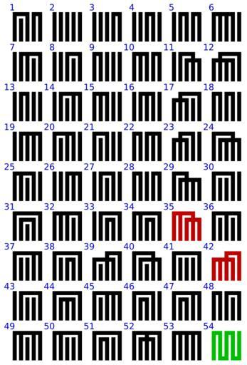 Keywords: Genji chapter symbols groupings of 5 elements.svg thumb 150px The 52 w Partition of a set partitions of a 5-element set The Genji-mon 源氏紋 or Genji-Kô 源氏香 symbols used for the 54 chapters of the Tale of Genji early Japanese novel They indicate the possible groupings and subgroupings of five elements from no element being grouped together with any other element chapter 2 to all five elements joined in a single grouping chapter 53 and everything in between In the notation used in the chapter symbols elements which are under a common horizontal bar are grouped together -- except that where a vertical stem crosses a horizontal bar as opposed to a corner or T this does not indicate a grouping So the symbols for chapters 35 and 42 shown in red in the diagram both indicate the same grouping elements 1 2 and 4 in one subgroup elements 3 and 5 in another subgroup The 52 possible 5-element subgroupings were expanded to 54 the number of chapters in the Tale of Genji by using equivalent representations for chapters 35 and 42 and by adding a special symbol for chapter 54 shown in green in the diagram In the incense-distinguishing game see en Kōdō Kumikō apparently the chapter 1 symbol takes the place of the chapter 35 symbol while the chapter 54 symbol is dropped see File Genjikonozu PNG leaving one symbol for each of the 52 possible groupings 52 is a Bell number Self-made graphic generated from abstract geometry and publicly-available information own 2010 AnonMoos Genji chapter symbols Kōdō Language-neutral diagrams |