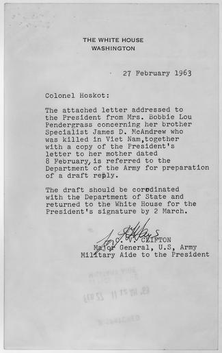 | Keywords: Genral Clifton to Colonel Hoskot Re, James D. McAndrew February 27, 1963 - NARA - 194133.tif Scope and content Note from General Chester V Clifton to Colonel Hoskot concerning letter from Mrs Bobbie Lou Pendergrass on the death of her brother Armry Specialist James D McAndrew General notes 194133 Local identifier President 1961-1963 Kennedy Office of the President 01/20/1961 - 11/22/1963 John F Kennedy Library NLJFK Columbia Point Boston MA 02125-3398 1963-02-27 Record group Collection JFK-WHCF Papers of President Kennedy White House Central Files 01/20/1961 - 11/22/1963 Record group ARC 1176 Papers of President Kennedy White House Central Files White House Subject File compiled 01/20/1961 - 11/22/1963 Series ARC 194123 File unit Papers of President Kennedy White House Central Files White House Subject File National Security - Defense 01/20/1961 - 11/22/1963 File unit ARC 194127 Variant control numbers NAIL Control Number NLK-WHCF-SBJCTFL-ND922M-NOTEREMCANDREW yes Other versions NARA-cooperation PD-USGov Documents in English |