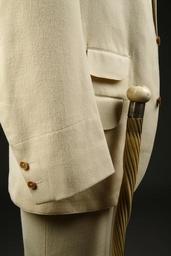 | Keywords: Gentlemannen - om män och mode - Hallwylska museet - 85872.tif KOSTYM kavaj- <br/><br/>Bestående av kavaj väst och byxor <br/><br/>Av vit cheviot samt med gulvita benknappar Hand- och maskinsydda <br/><br/>Kavaj Enradig livskuren med fyra knappar samt nedviken krage och korta slag i det vänstra ett knapphål; framstyckenas hörn rundade Ryggen med sid- och axelsömmar Knapparna runda fyrhåliga med plan framsida och stavformig kant Foder av smalrandigt vitt siden alpacka på högra framstycket en bröstficka; ärmfoder av smalrandigt crèmegult halvsiden <br/><br/>Mått Ärmhålsdjup 23 cm ; längd hel 76 cm ; ryggbredd halv 19 cm ; ärmlängd 80 cm ; bröstvidd fram 44 cm ; bröstvidd hel 106 cm ; livvidd 98 cm <br/><br/>Väst Enradig med sex knappar som de mindre i kavajen korta vinkelskurna slag samt två svagt snedskurna sidofickor samt på vänstra framstycket dessutom en dylik bröstficka alla med rak kantslå Ryggstycke av vit ylleklot ett stycke från nedre kanten två spänntampar med spänne av svartlackerad mässing och med två taggar tornar Nedtill i mitten ett sprund Fodret i rygg- och framstycken av blommig vit bomullssatin <br/><br/>Mått Schalöppning 31 cm Hel västlängd 70 cm <br/><br/>Byxor Upptill på vardera framstycket en snedskuren tvärficka Midjeband med hake och hyska knapp och knapphål samt sex hängselknappar Gylfen med fyra små knappar ock knapphål Midjebandet fodrat med rött skinn saffian bak- och gylffoder av vitt bomullstyg Fickor av vitt bomullstyg Knapphålen handsydda med vitt grovt silke eller vit bomullstråd <br/><br/>Mått Yttersöm längd 106 cm ; innersöm längd 82 cm ; livvidd 82 cm ; stussvidd 108 cm ; lårvidd 66 cm ; knävidd 48 cm ; vidd nedtill 46 cm <br/><br/>Förfärdigade efter beställning av Walther von Hallwyl i Oktober 1900 hos skrädderifirman Fr Kaedings Efterträdare Zittorin Lundvik hovleverantörer <br/><br/>Begagnad av Walther von Hallwyl under hans resa genom Egypten och Sudan tillsammans med sin maka dotter och svärson samt fröken Ida Uhse den 5 November 1900 till 29 Mars 1901 original caption Gentlemannen - om män och mode HWY Walther von Hallwyl place of origin Stockholm SE original filename hm_dig1923 8246 inventory number HWY XXI I A 03 85872 CC-BY-SA Samuel Uhrdin <gallery caption Different images of same object > File Gentlemannen - om män och mode - Hallwylska museet - 85871 tif File Kavajkostym bestående av kavaj väst och byxor Tillhört Walther von Hallwyl - Hallwylska museet - 89103 tif File Gentlemannen - om män och mode - Hallwylska museet - 85873 tif File Detalj av kostym Foto till boken Ett sekel av dräkt och mode ur de Hallwylska samlingarna - Hallwylska museet - 89347 tif File Kostym detalj Foto till boken Ett sekel av dräkt och mode ur de Hallwylska samlingarna - Hallwylska museet - 89386 tif </gallery> Samuel Uhrdin Clothing in the Hallwyl museum Male clothing Trousers Media contributed by LSH unmatched objKeyword Media contributed by LSH unmatched creator Media contributed by LSH 2013-10 |