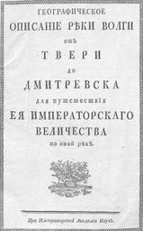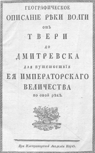 | Keywords: Geographical description of the Volga River (1767).jpg Титульный лист из книги Стафенгаген И И Геог афическое описание еки Волги от Тве и до Дмит иевска для путешествия Ея Импе ато скаго Величества по оной еке СПб П и Имп Акад наук 1767 9 л 8 л ка т scan 1767 И И Стафенгаген PD-RusEmpire Title pages in Russian Title pages from Russia Volga PD-old-100 | ||||