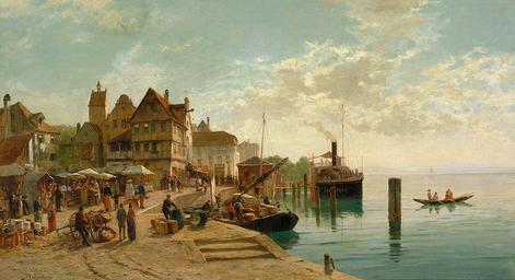 | Keywords: Georg Dehn Am Bodenssee.jpg Am Bodensee Blick auf das alte Buchhorn mit angelegtem Schiff und Markttreiben am Ufer Reizendes Genre an einem sonnigen Tag Vermutlich identisch mit dem bei Boetticher aufgeführten Werk der Bayer Landesausstellung 1882 Öl auf Leinwand 67 x 118 cm http //www zeller de/ Zeller Auktionen ~ 1882 Georg Dehn 1843 “1904 PD-art-100 Georg Dehn Lake Constance in art Friedrichshafen in art 1882 paintings Images from Auktionshaus Zeller | ||||