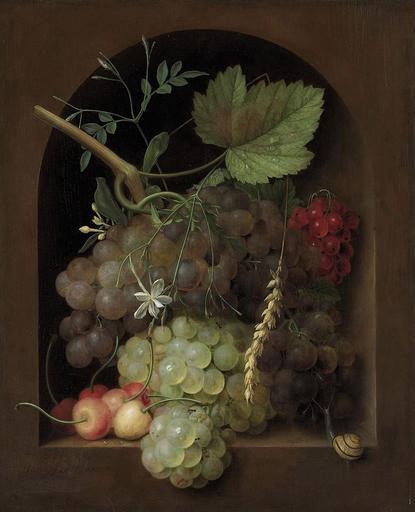 | Keywords: Georg Frederik Ziesel - Grapes, cherries and wheat with a snail in a stone niche.jpg Artwork Creator Georges Frédéric Ziesel oil panel cm 31 1 26 6 object history ProvenanceEvent 1989-04-21 anonymous sale Christie's London lot 17 credit line the former with signature and date 'Jan Van Huysum fecit 1724' lower left ; and the latter with signature and indistinct date 'Jan van Hysum fecit 1725' lower left sic accession number Christie's online 5391316 PD-Art-100 Georges Frédéric Ziesel 18th-century still life paintings of fruits 18th-century still life paintings Niches in art Paintings of grapes 18th-century oil on panel paintings Snails in art Location of museum or gallery missing |