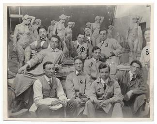| Keywords: smithsonian institution smithsonianinstitution sculptor class sculpture portrait men american sculptor americansculptor sculptors in a group sculptorsinagroup sculptors artists statues group studio indoors lober rubinstien sculptures artists classical preppy bl loberrubinstiensculpturesartistsclassicalpreppybl archives of american art archivesofamericanart monochrome Description: Lober among a group of eleven fellow sculpture students. Some individuals are numbered for identification. Identification on verso (handwritten): 1.[crossed out] 2. Rubinstine, 3. Abe Rosentine; 4. Patronni; 5. Salarno; 6. Georg Lober; 7. Rannus; About 1911; 8. Lipshits. Lober, Georg John, 1892-1961 Creator/Photographer: Unidentified photographer Medium: Black and white photographic print Dimensions: 10 cm x 13 cm Date: c. 1911 Persistent URL: www.aaa.si.edu/collections/images/detail/georg-j-lober-an... Repository: Archives of American Art Collection: Georg John Lober papers, [ca. 1915-1970] Accession number: aaa_lobegeor_4955 Description: Lober among a group of eleven fellow sculpture students. Some individuals are numbered for identification. Identification on verso (handwritten): 1.[crossed out] 2. Rubinstine, 3. Abe Rosentine; 4. Patronni; 5. Salarno; 6. Georg Lober; 7. Rannus; About 1911; 8. Lipshits. Lober, Georg John, 1892-1961 Creator/Photographer: Unidentified photographer Medium: Black and white photographic print Dimensions: 10 cm x 13 cm Date: c. 1911 Persistent URL: www.aaa.si.edu/collections/images/detail/georg-j-lober-an... Repository: Archives of American Art Collection: Georg John Lober papers, [ca. 1915-1970] Accession number: aaa_lobegeor_4955 |