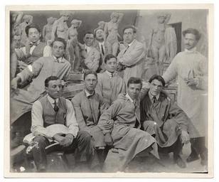| Keywords: smithsonian institution smithsonianinstitution sculptor beaux-arts institute of design beauxartsinstituteofdesign denmark students smocks nudes group sepia group of men groupofmen pose white frame whiteframe class male artists maleartists manequins archives of american art archivesofamericanart monochrome Description: Lober among a group of eleven fellow sculpture students. Identification on verso (handwritten): about 1911 or 12. Published in: Archives of American Art Journal v. 12, no. 2, p. 23. Lober, Georg John, 1892-1961 Creator/Photographer: Unidentified photographer Medium: Black and white photographic print Dimensions: 10 cm x 13 cm Date: c. 1911 Persistent URL: www.aaa.si.edu/collections/images/detail/georg-j-lober-an... Repository: Archives of American Art Collection: Georg John Lober papers, [ca. 1915-1970] Accession number: aaa_lobegeor_4957 Description: Lober among a group of eleven fellow sculpture students. Identification on verso (handwritten): about 1911 or 12. Published in: Archives of American Art Journal v. 12, no. 2, p. 23. Lober, Georg John, 1892-1961 Creator/Photographer: Unidentified photographer Medium: Black and white photographic print Dimensions: 10 cm x 13 cm Date: c. 1911 Persistent URL: www.aaa.si.edu/collections/images/detail/georg-j-lober-an... Repository: Archives of American Art Collection: Georg John Lober papers, [ca. 1915-1970] Accession number: aaa_lobegeor_4957 |