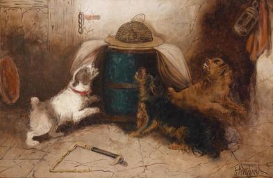 | Keywords: George Armfield Three Dogs Barking at a Mouse.jpg Drei Hunde verbellen eine Maus signiert G Armfield Öl auf Leinwand 50 5 x 76 cm Three Dogs Barking at a Mouse signed G Armfield oil on canvas 50 5 x 76 cm http //www dorotheum com Dorotheum century 19 George Armfield c 1808-1893 PD-old-100 Images from Dorotheum 19th-century paintings of dogs Mousetraps in art | ||||