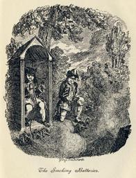 | Keywords: George Cruikshank - Tristram Shandy, Plate VIII. The Smoking Batteries.png From George Cruikshank's illustrations to Laurence Sterne's Tristram Shandy Plate VIII The Smoking Batteries Uncle Toby is in the sentry box the corporal on the right Basically the corporal has invented a way to make multiple cannons be fired at once by using the principles of a hookah - when a puff is taken the cannons fire Unfortunately the two find the puffing a little too enjoyable The Life and Opinions of Tristram Shandy Gentleman and A Sentimental Journey Through France and Italy by Laurence Sterne With Illustrations by George Cruikshank London Hutchinson Co Paternoster Row 1906 This version published 1906 George Cruikshank 1792 “1878 PD-Old-100 Part of a series of illustrations of Tristram Shandy <gallery widths 200px heights 250px> File George Cruikshank - Tristram Shandy Plate I The Effects of Trim's Eloquence jpg Plate I The Effects of Trim's Eloquence<br/> PNG Scan File George Cruikshank - Tristram Shandy Plate II Obadiah leading in Dr Slop jpg Plate II Obadiah leading in Dr Slop<br/> PNG Scan File George Cruikshank - Tristram Shandy Plate III The Jack-boots transformed into Mortars jpg Plate III The Jack-boots transformed into Mortars<br/> PNG Scan File George Cruikshank - Tristram Shandy Plate IV The long-nosed Stranger of Strasburg jpg Plate IV The long-nosed Stranger of Strasburg<br/> PNG Scan File George Cruikshank - Tristram Shandy Plate V My Uncle Toby on his Hobby-horse jpg Plate V My Uncle Toby on his Hobby-horse<br /> PNG Scan File George Cruikshank - Tristram Shandy Plate VI Trim's relation of Tristram's misfortune jpg Plate VI Trim's relation of Tristram's misfortune<br/> PNG Scan File George Cruikshank - Tristram Shandy Plate VII The Quarrel of Slop and Susannah jpg Plate VII The Quarrel of Slop and Susannah<br/> PNG Scan File George Cruikshank - Tristram Shandy Plate VIII The Smoking Batteries jpg Plate VIII The Smoking Batteries<br/> PNG Scan </gallery> minor cleanup and levels adjustment George Cruikshank's illustrations of Tristram Shandy 1832 8 GCTS |