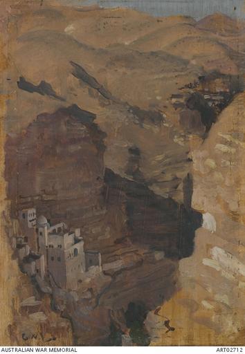 | Keywords: George Lambert. Monastery in the ravine of Wady Kelt. 1918.JPG Artwork Creator George Washington Lambert en The Greek monastery of St George was built in the late fifth century It is believed to contain the cave where Elijah was fed by the ravens It was hewn out of the precipitous cliffs of the Wady Kelt a few kilometres above Jericho Lambert used a vertical format to get a sense of the unusual location the precipitous cliffs and the way the monastery is part of the rock face c date 1918 05 oil wood panel cm 22 15 6 Australian War Memorial Canberra accession number ART02712 ART02712 PD-old-auto-1923 1930 George Washington Lambert Paintings of World War I in the Australian War Memorial Judean Desert in art St George's Monastery 1918 paintings Art of Australia Wadi Qelt 1918 in Ottoman Palestine |