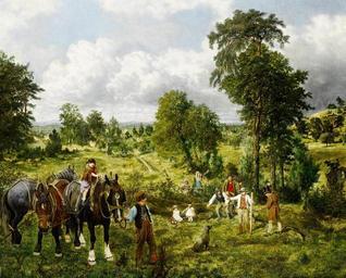 Keywords: george mote painting art artistic artistry oil on canvas landscape sky clouds nature outside country countryside trees scenic people horses summer rural