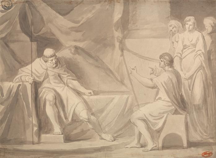 Keywords: George Romney - David before Saul - Google Art Project.jpg Inscribed in graphite upper left 8 Not on View Gray and brown wash with gray and brown ink over graphite on medium slightly textured cream laid paper moustache beard women men blocks columns step crown costume component bench stool curtains brooch dresses cloak kerchiefs spear harp figure study historical subject special url_id NAH9-wV6lkDXww PD-old-100-1923 1802 Google Art Project works by George Romney David and Saul |
