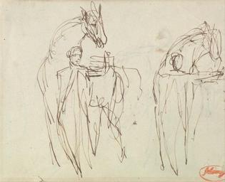 | Keywords: George Romney - Sketches for a Man with a Horse - Google Art Project.jpg Inscription _Marks en watermark top Not on View Brown ink on medium slightly textured cream laid paper horse animal man wig figure study sporting art special url_id mQFQAaJhgcPY7Q PD-old-100-1923 1802 Drawings by George Romney Google Art Project works by George Romney Collections of the Yale Center for British Art | ||||